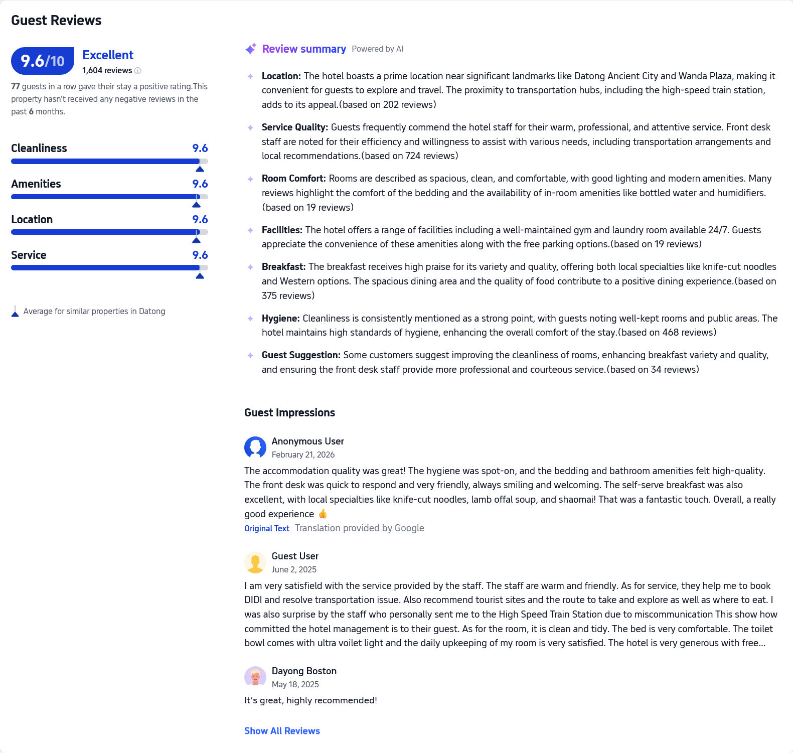 For those planning a visit to Datong, Shanxi, whether for business, cultural exploration, or transit convenience, the Jianguo HIDDEN Hotel Flagship Store represents a choice backed by over 1,600 satisfied guests. The consistent stream of positive reviews, absence of recent negative feedback, and staff’s demonstrated commitment to going above and beyond make this property a trustworthy selection for your next journey through China’s ancient northern capital.